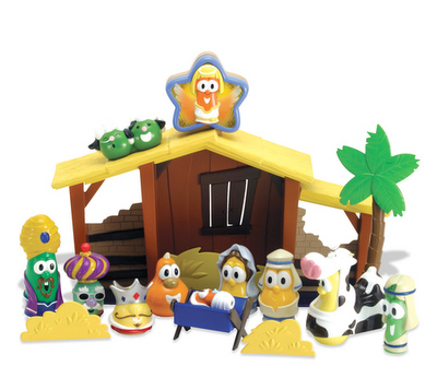 That right there is the Veggie Tales Nativity. In case you don't know, Veggie Tales are cute vegetables who love Christ and salad tossing. The newborn savior up there is a carrot. Get it? A baby carrot? What a delight.